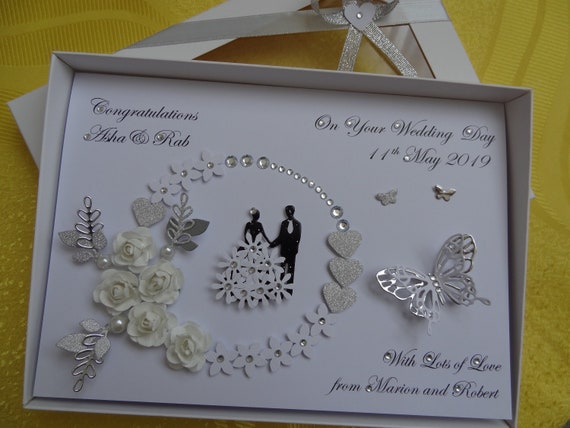 Handmade wedding card ( able to change colour and name of bride and groom added ) made with love blank insert white envelope included comes in plastic sleeve card is shipped in between two cardboards and posted in a padded postal envelope. Brides and grooms will appreciate the time and special effort you took to craft an original greeting card. Understanding the eternity of a wedding card, mostly handmade prints only on the richest card. Elegant luxury wedding cards wrapped in opulence.