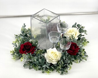 Floral Wreath Wedding Centerpiece With Floating Candles In Sqaure Cylinder Va Floating Candles Wedding Wedding Reception Candles Wedding Reception Centerpieces from i.pinimg.com