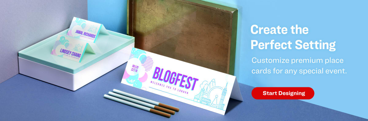 Home > personalized tent place cards. Choose from thousands of unique designs created by our talented team of independent designers. Personalized place cards are available in assorted styles, colors and finishes to seat your guests with a personal touch. Placecards are as important as many of the other pieces in your stationery collection.