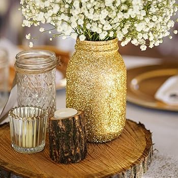 [photo gold wine bottle and milk glass centerpiece. Our etched stemless wine glasses are the perfect engagement, bridal shower, wedding, and hostess gifts. You can still have an elegant and memorable wedding on a shoestring budget.