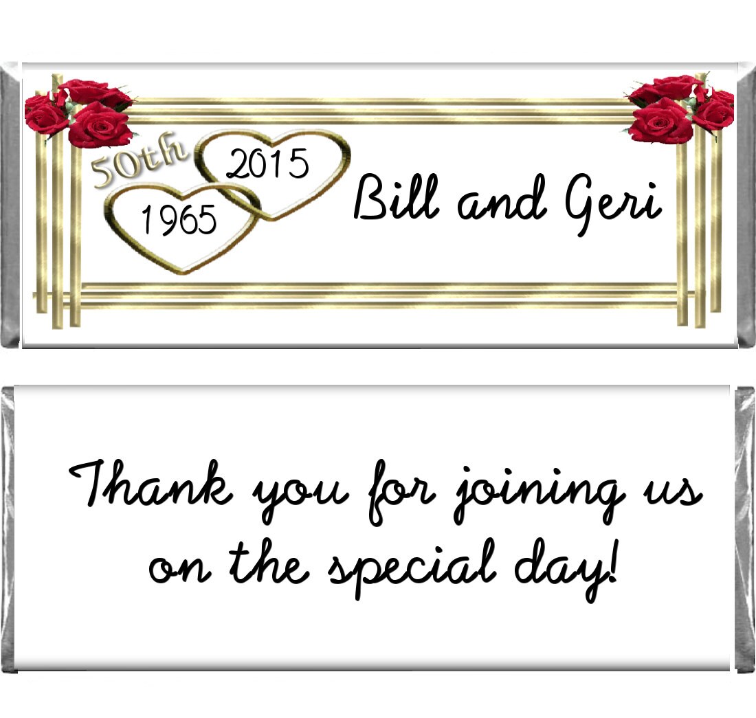 50th anniversary wedding candy wrappers party favors. Just about everyone loves getting gift baskets! Both the modern and traditional 50th anniversary gifts are gold, which symbolizes prosperity, strength. Mix and match any design whether it's a first anniversary, tenth anniversary, 25th anniversary or 50th anniversary ~ celebrate any anniversary with a memorable personalized candy wrapper!