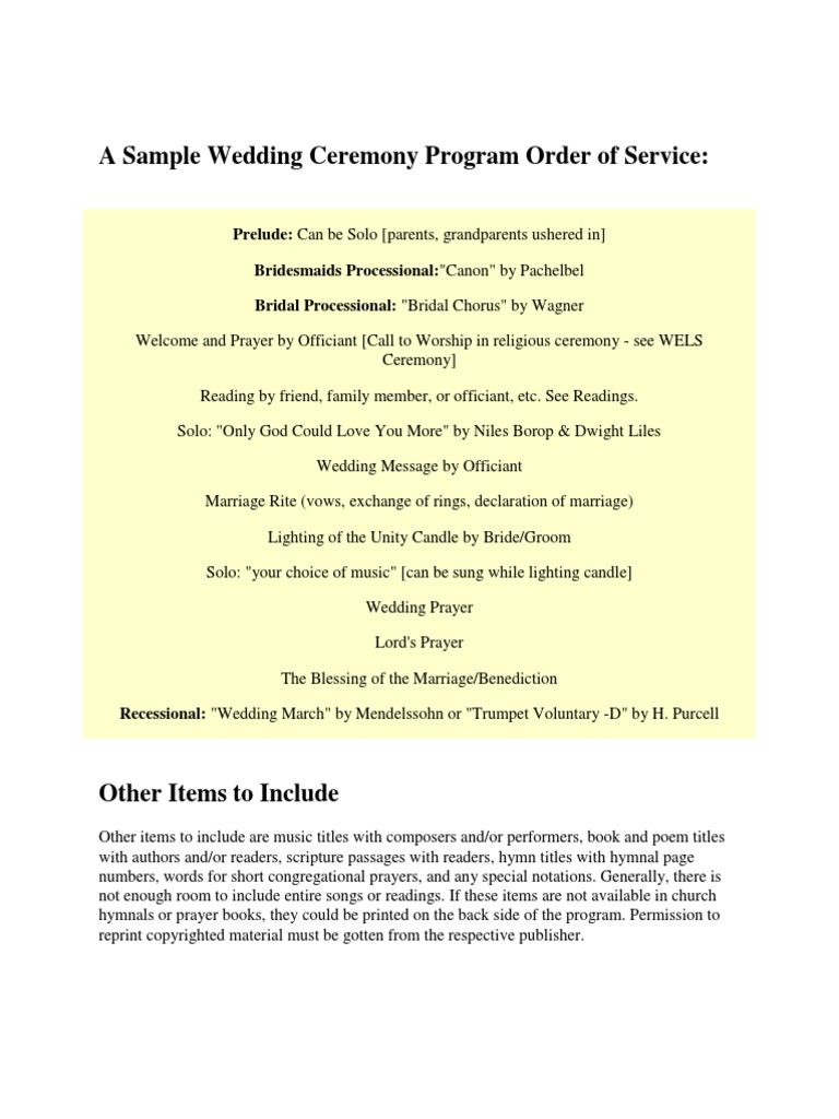 Your church or religious secretary may have wedding program samples from previous ceremonies for you to use as a guide. Lining up the bridal party 4. Documents similar to a sample wedding ceremony program order of service. Be sure to list the events in the order they will occur and.